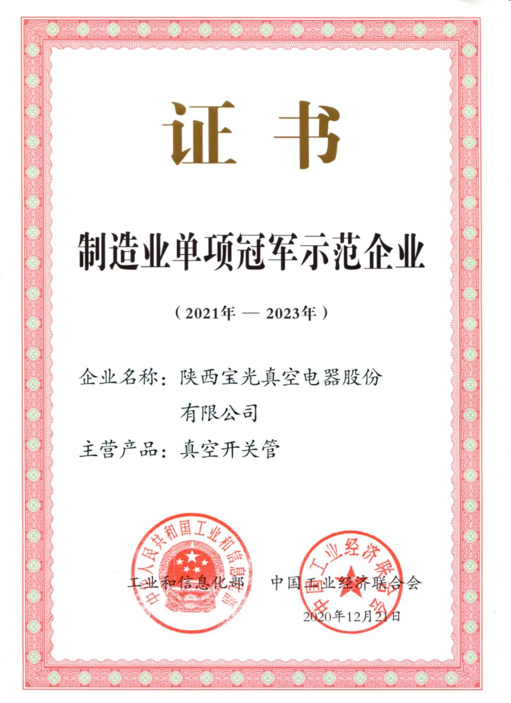 日前,陜西寶光真空電器股份有限公司(以下簡稱“寶光股份”)繼2017年入選制造業(yè)單項冠軍后,順利通過工業(yè)和信息化部與中國工業(yè)經(jīng)濟聯(lián)合會復核,蟬聯(lián)“制造業(yè)單項冠軍示范企業(yè)(2021-2023)”。